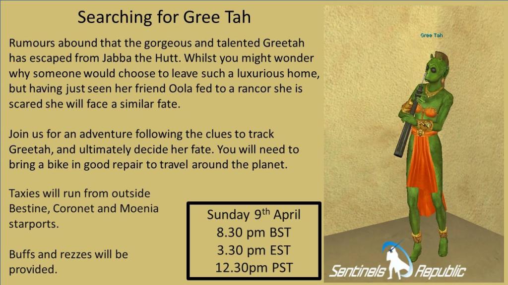 April already has an Easter event lined up (Sunday 8th) where players can expect a treasure hunt, a world boss, and ‘bunny chaos’. The very next day the Searching for Gree Tah event will have players scouring the galaxy for Jabba’s runaway musician.